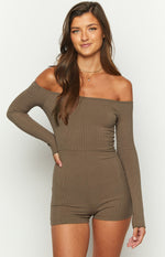 - Lounge in style with this brown off-the-shoulder ribbed playsuit. Look effortlessly put together at your morning coffee with a pair of sunglasses and white sneakers. Throw on a blazer for a chic street style look.